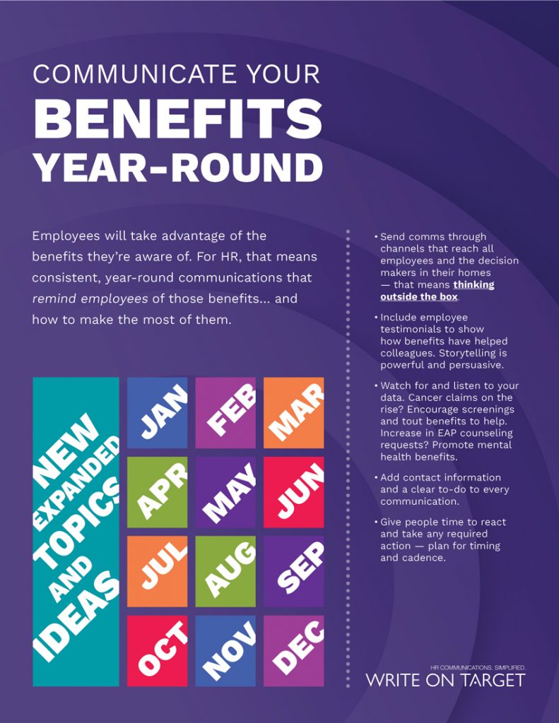 Clear and consistent employee benefits communication can turn that around and increase employees’ overall satisfaction with their benefits… and their employer. Remind employees about their benefits — and how to use them — all year long. The benefits calendar above makes it easy to find topics each month.